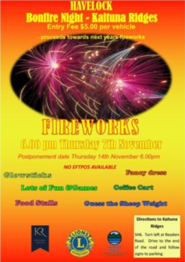 Join in the fun at the annual Fireworks and Bonfire night at Kaituna Ridges farm. As well as the fireworks there'll be fun games to be a part of, and snacks and drinks for purchase.